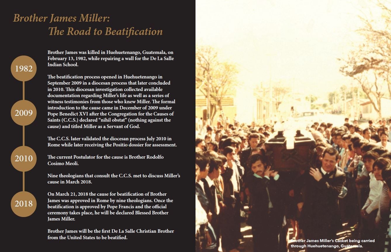 The beatification of Brother James Miller is a cause of great joy for the Brothers, Partners, Students and all members of the Lasallian Family. As we reflect on Brother James' life and ministry, let us consciously contemplate the light of Christ and redouble our efforts to share the Good News with all whom we encounter.